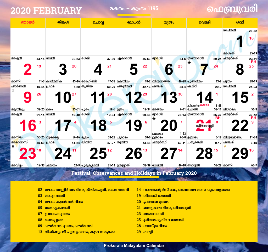 Malayalam Calendar 2022 February